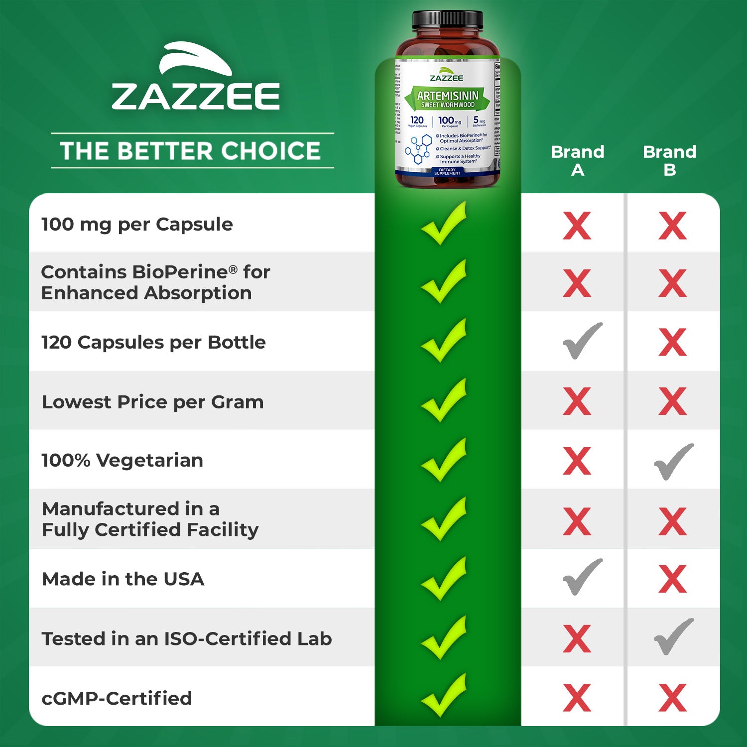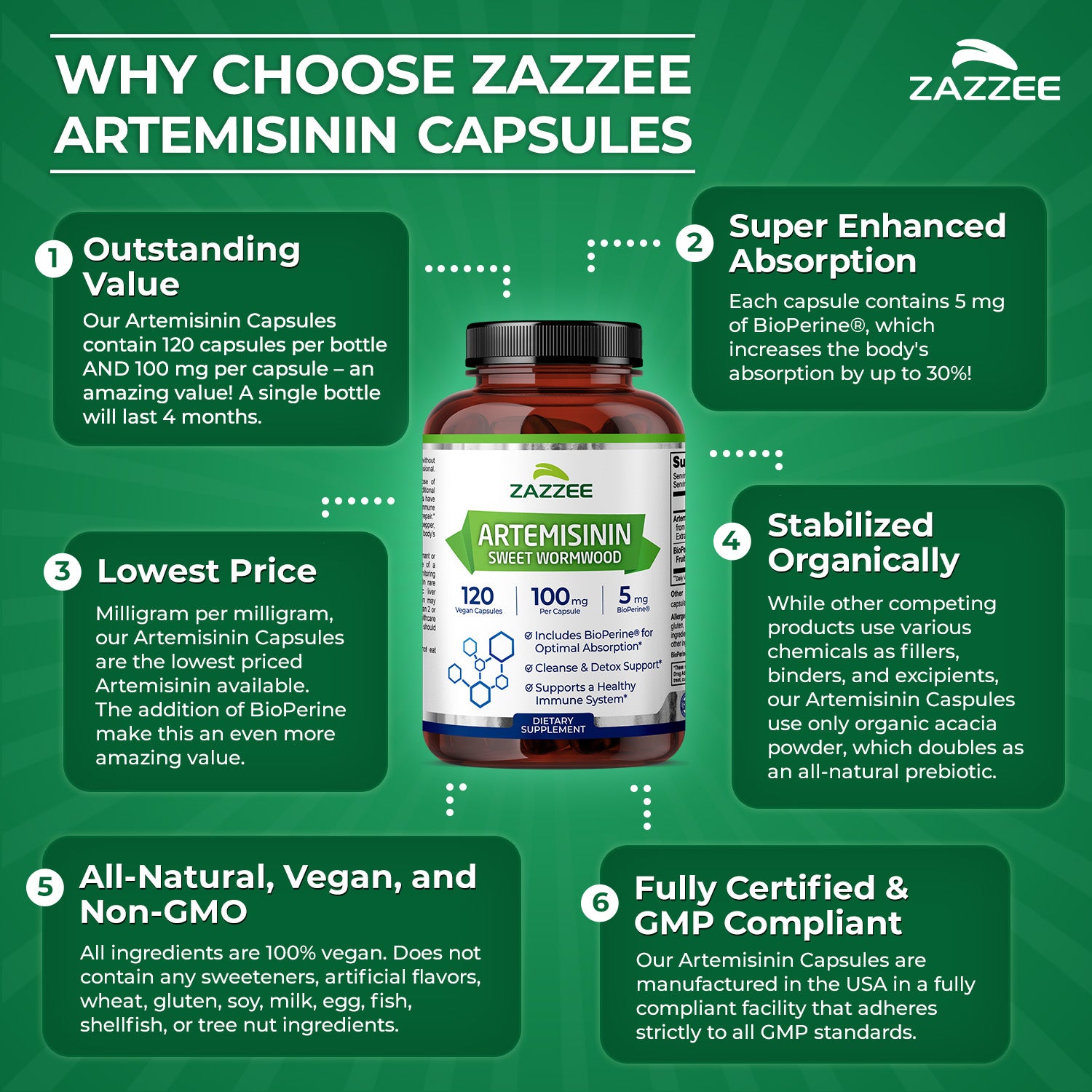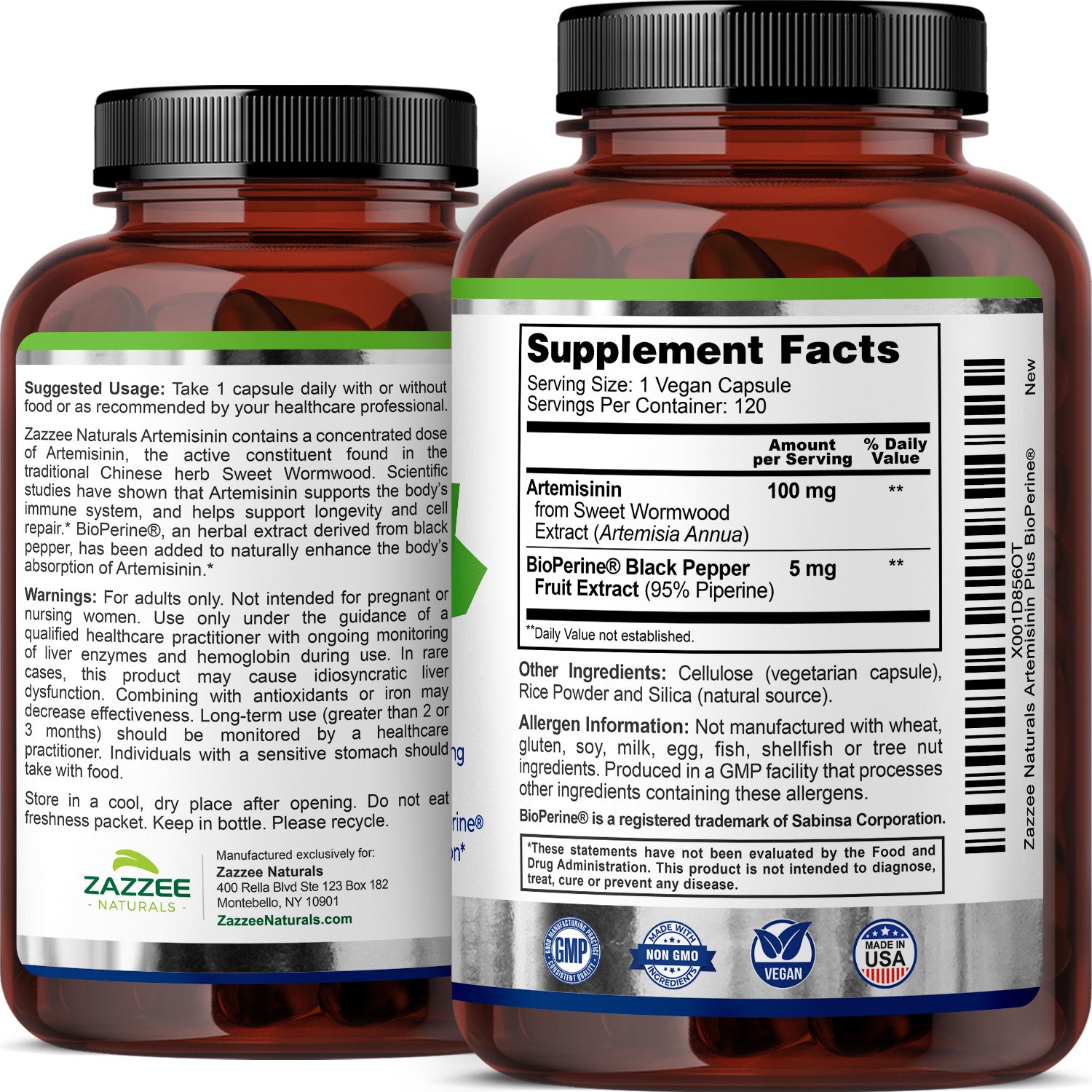 Our Artemisinin is enhanced with 5 mg of BioPerine, an all-natural extract derived from black pepper. Numerous studies have shown that the addition of BioPerine increases the body's absorption of other ingredients by up to 30%! Zazzee Naturals Artemisinin is the ONLY Artemisinin on the market with added BioPerine, which means our Artemisinin gives you the highest rate of absorption and most benefit available.