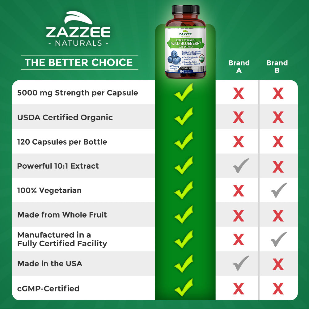 Any Blueberry that is not CERTIFIED organic can be highly contaminated and even harmful. With Zazzee Naturals Certified Organic Wild Blueberry, you can be sure your Blueberry is organic, all-natural, vegan, and non-GMO. More, while other competing products use various chemicals as fillers, binders, and excipients, our Organic Blueberry instead uses a unique Organic Stabilizer Blend.