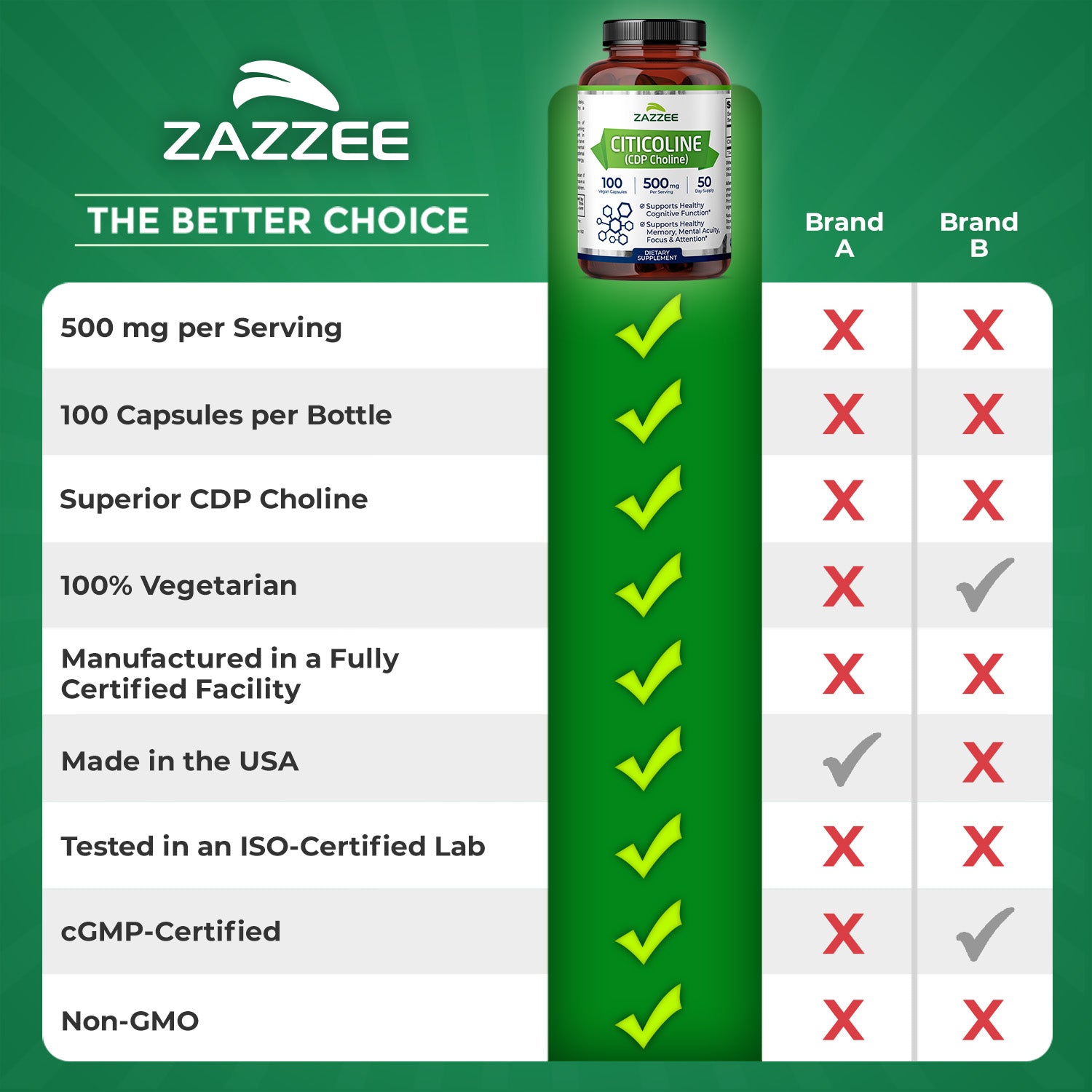 Our Citicoline contains 500 mg per serving AND 100 capsules per bottle – an amazing value! Compare this to other leading brands that contain lower dosages and less servings per bottle.