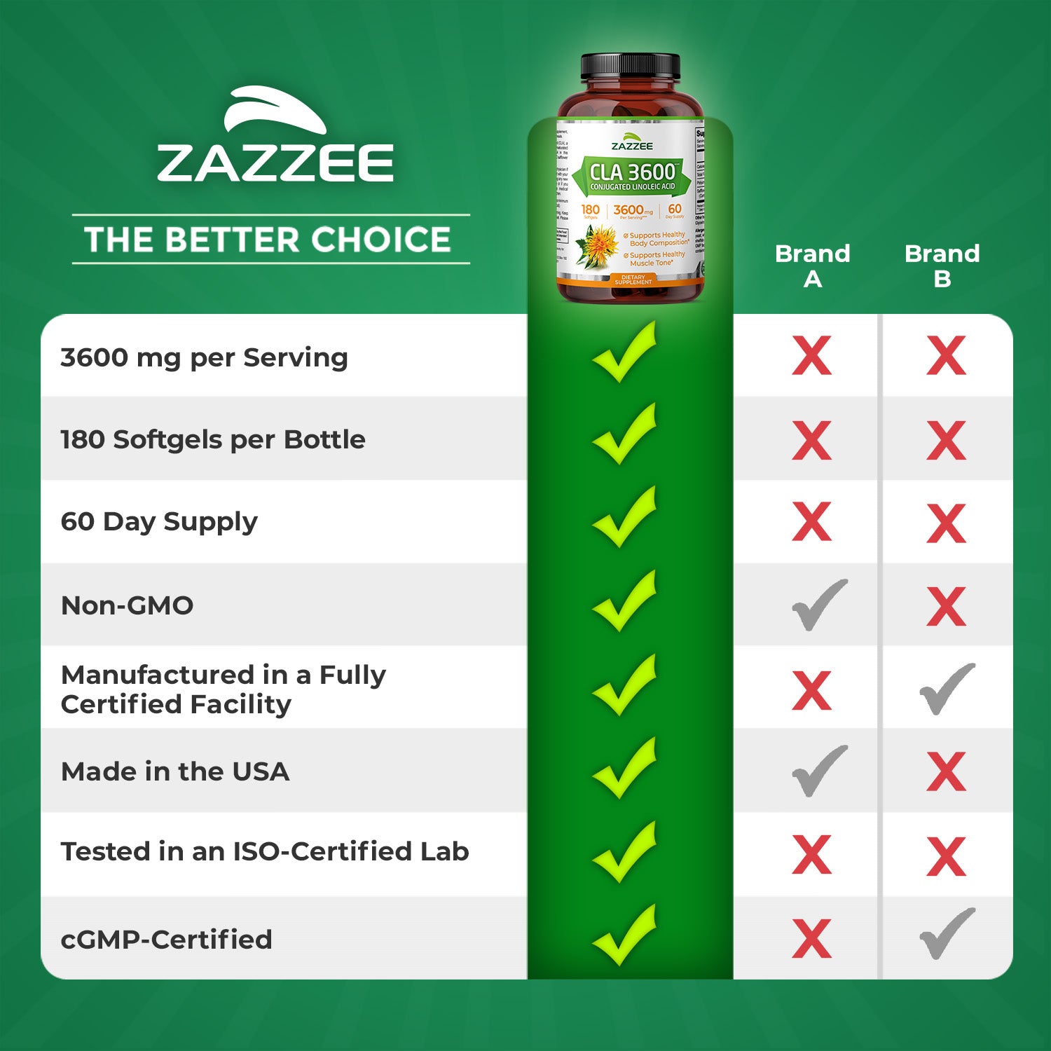 Each serving contains a potent, effective 3600 mg of CLA. Numerous clinical studies have shown that 3600 mg is an optimal dosage.