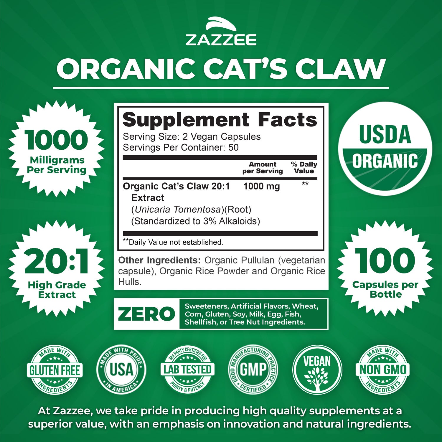 All ingredients, including the capsule, are 100% USDA Organic. With Zazzee Certified Organic Cat’s Claw, you can be sure your Cat’s Claw is organic, all-natural, vegan, and non-GMO. Our Organic Cat’s Claw Extract does not contain any sweeteners, artificial flavors, wheat, corn, gluten, soy, milk, egg, fish, shellfish, or tree nut ingredients.